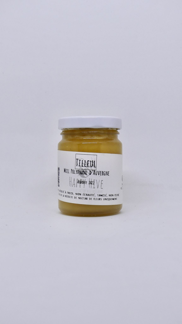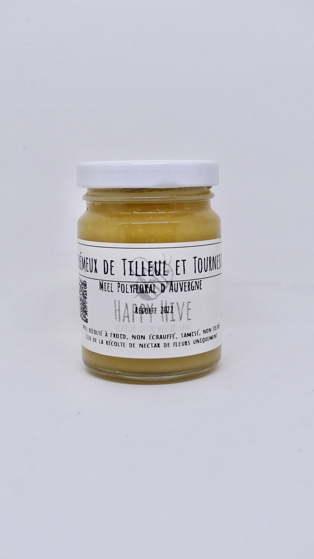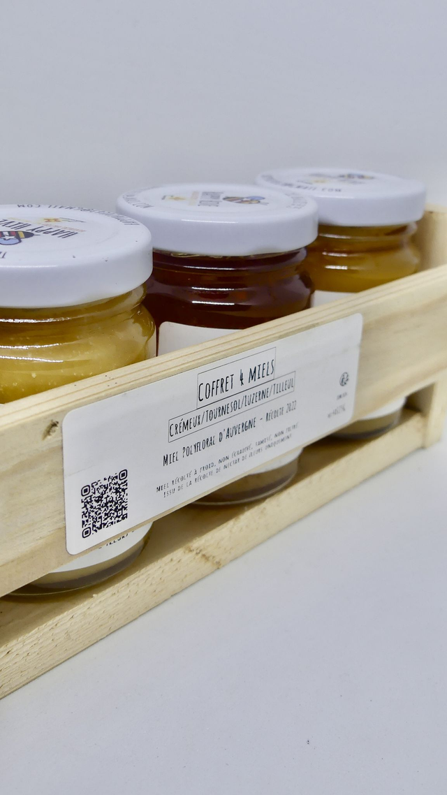 Petite caissette artisanale présentant un éventail de quatre saveurs de miels dans des pots de 125g : miel de tournesol, miel de luzerne, miel de tilleul, miel crémeux.